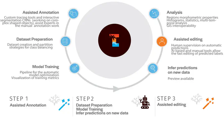 Fully automatic semantic segmentation of highly specific semantic classes and complex shapes may not meet the accuracy standards demanded by scientists. In such cases, human-centered AI solutions, able to assist operators while preserving human control over complex tasks, are a good trade-off to speed up image labeling while maintaining high accuracy levels. TagLab is an open-source AI-assisted software for annotating large orthoimages which takes advantage of different degrees of automation; it speeds up image annotation from scratch through assisted tools, creates custom fully automatic semantic segmentation models, and, finally, allows the quick edits of automatic predictions. Since the orthoimages analysis applies to several scientific disciplines, TagLab has been designed with a flexible labeling pipeline. We report our results in two different scenarios, marine ecology, and architectural heritage.